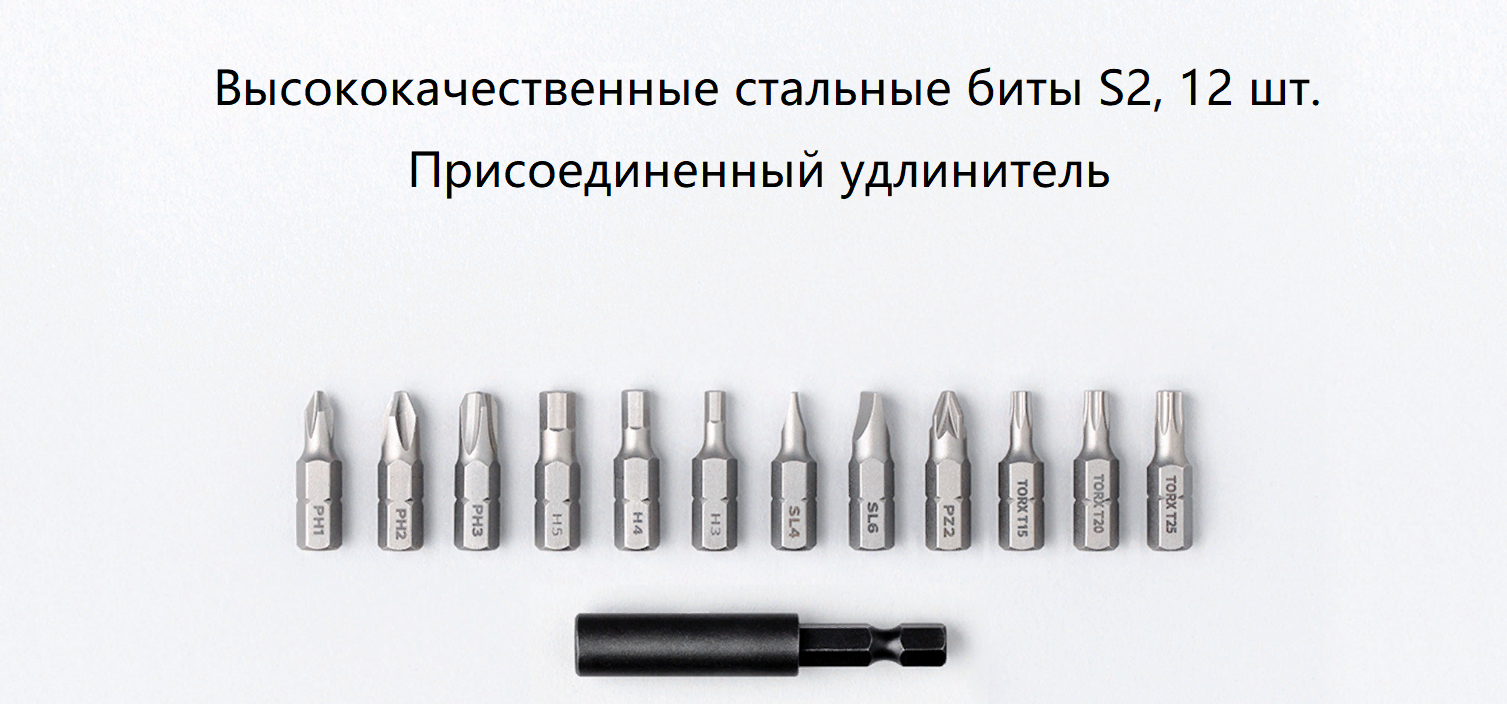 | Комплектация | документация, сумка, магнитный держатель, биты 12 шт. (PH1; PH2; PH3; SL4; SL6; H3; H4; H5; T15; T20; T25; PZ2), USB-кабель Type-C |
