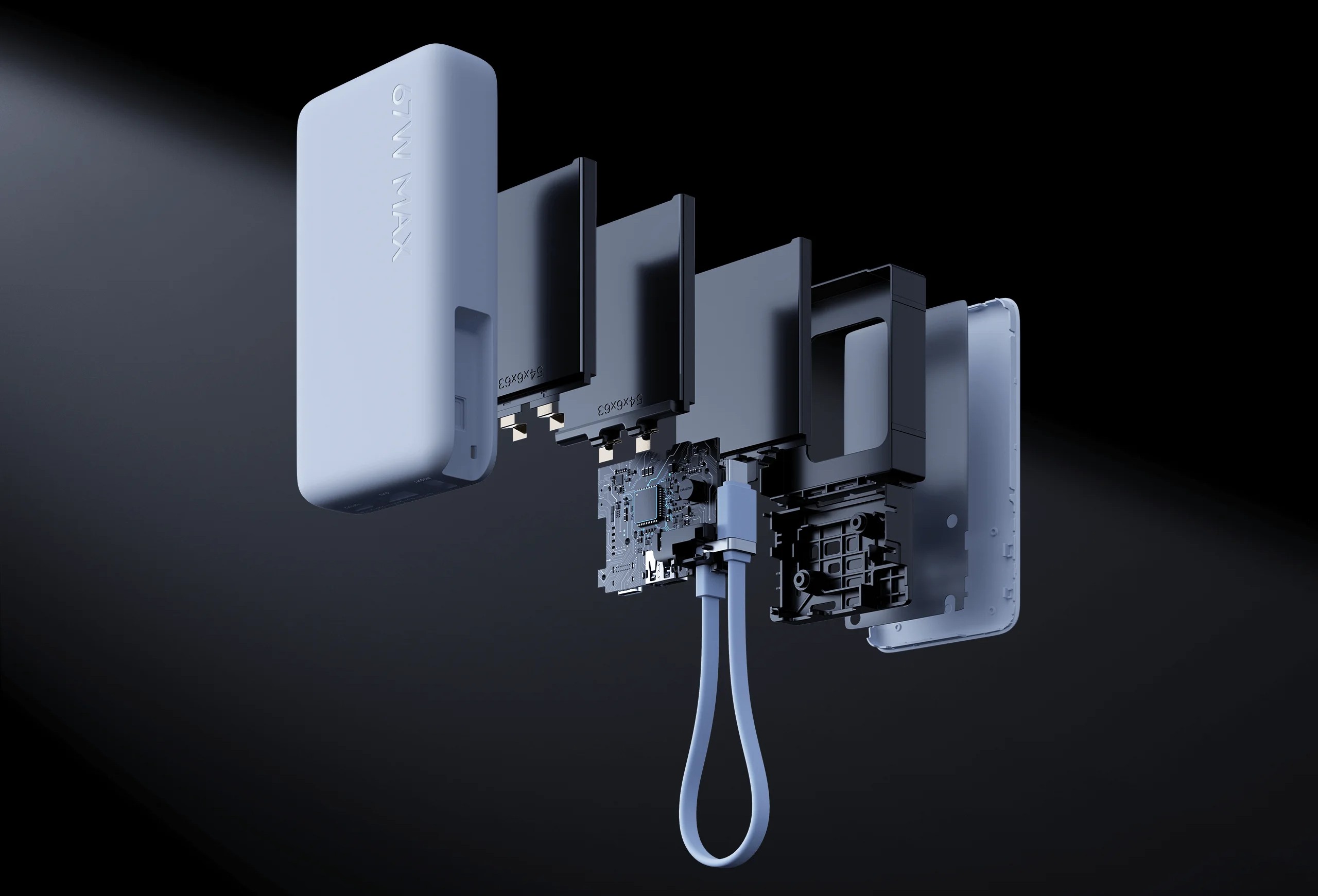 Внутри установлен литий-ионный аккумулятор ёмкостью 10 000 мАч. Главная особенность модели — высокая выходная мощность до 67 Вт, что позволяет заряжать не только смартфоны, но и более требовательные устройства. Поддерживаются различные профили напряжения от 5 до 20 В, благодаря чему пауэрбанк адаптируется под подключённую технику.