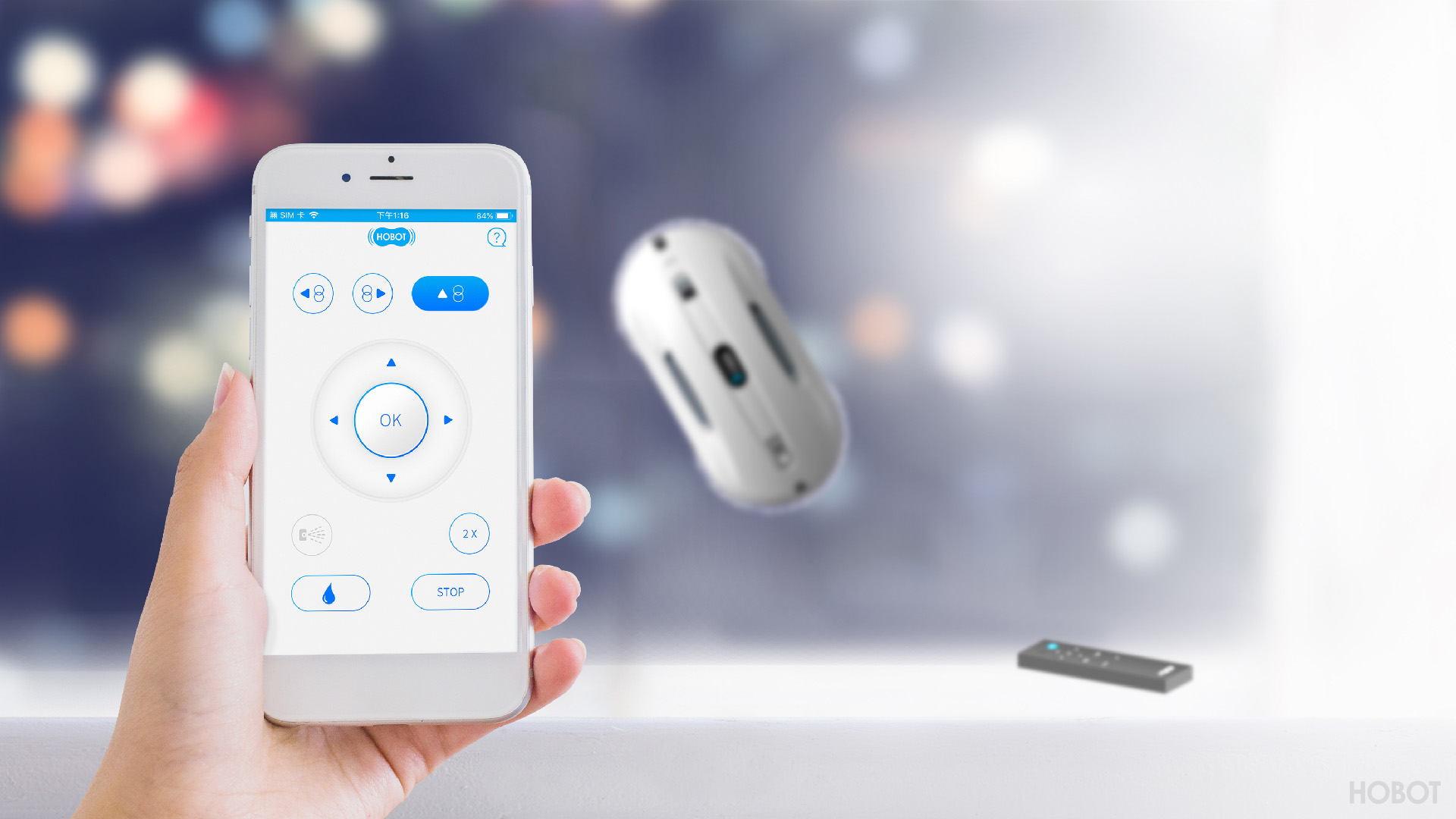 HOBOT-368 выполнен в компактном корпусе белого цвета с черными элементами. Устройство выглядит современно и аккуратно, а небольшие габариты и вес всего 0.94 кг делают его удобным для работы с окнами, зеркалами и другими стеклянными поверхностями.